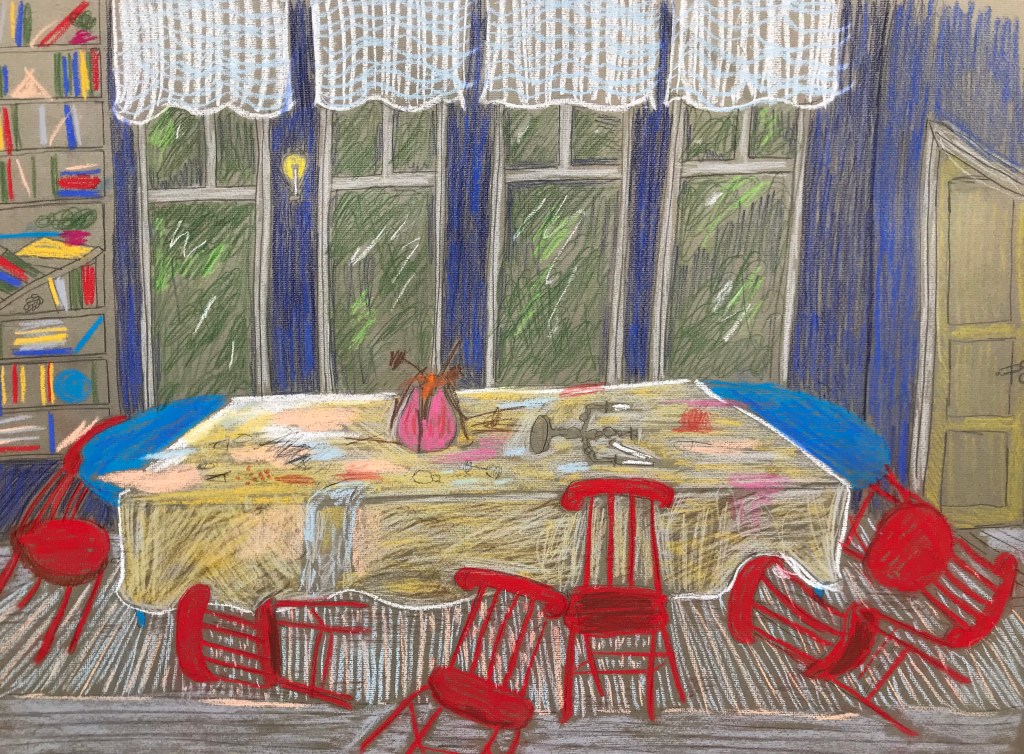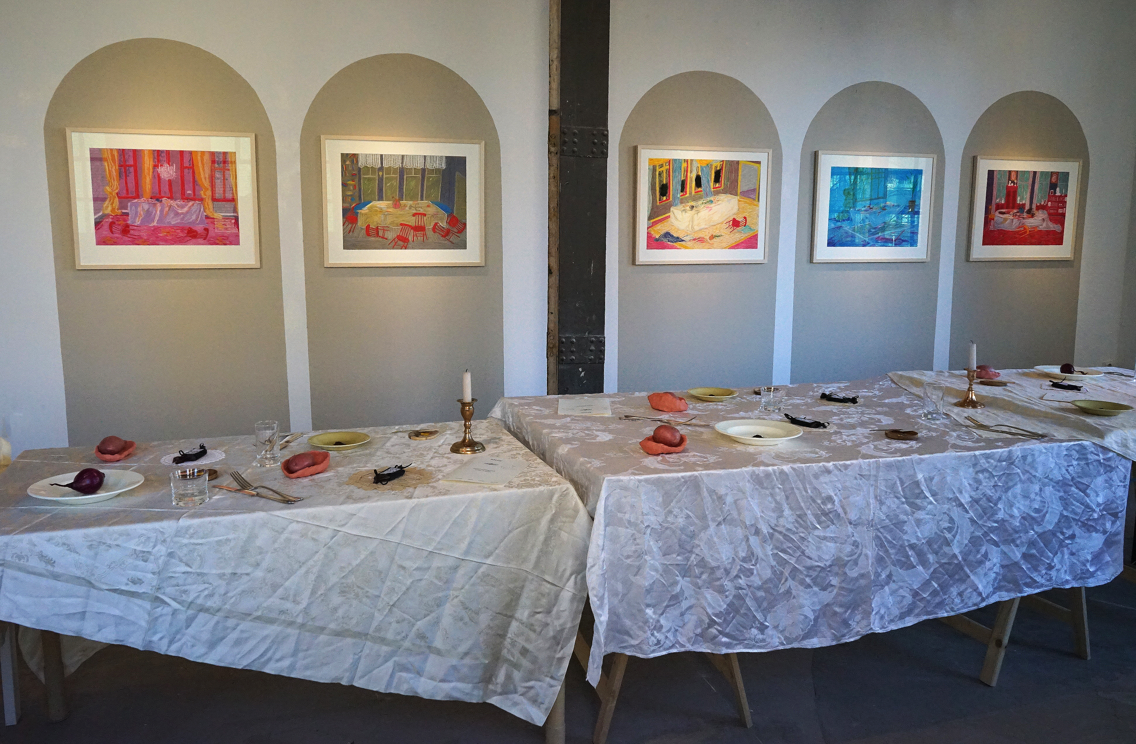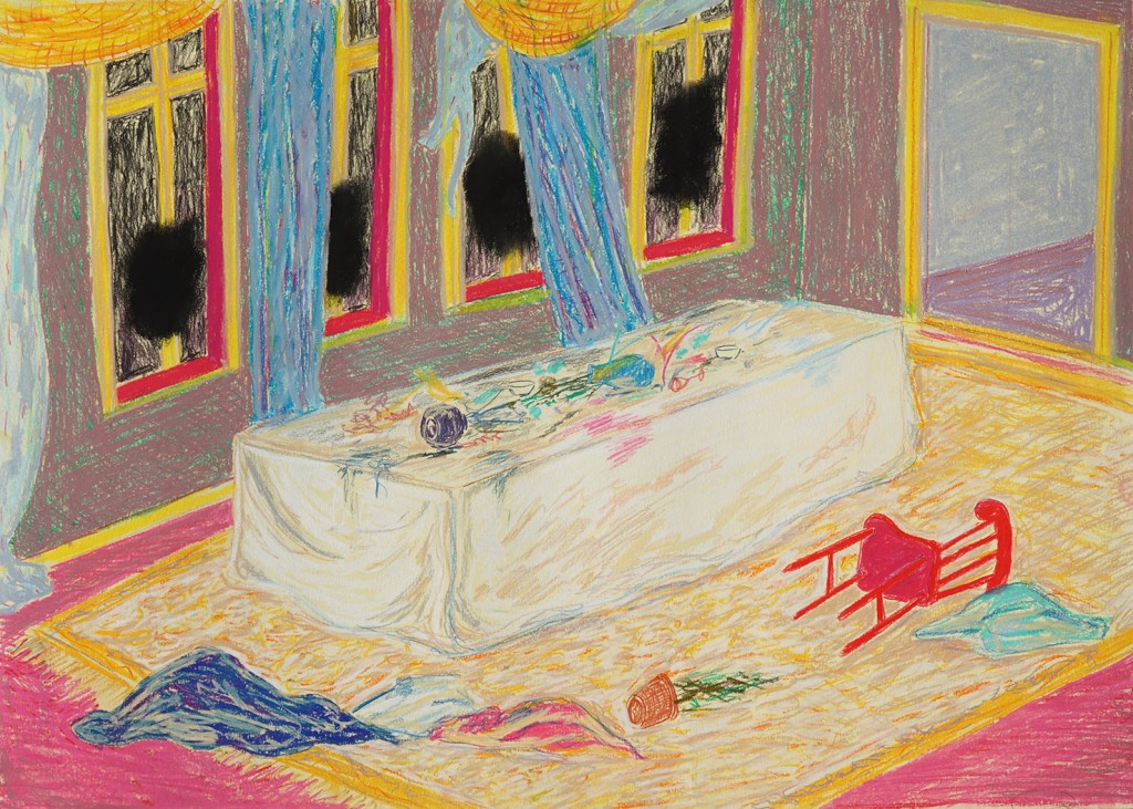 Torrpastell och video, 2020. I verket Kyrie Eleison möter vi ett övergivet, uppdukat middagsbord. Middagen tycks ha förfallit, ruttnat och lämnats kvar. Är det resterna av en fest som gått överstyr eller har människor tvingats fly hastigt och sedan aldrig återvänt? Kyrie Eleison är ett vanligt utrop i den kristna mässan och kan översättas till Herre förbarma dig, ett slags rop på hjälp och en önskan om skydd. I en tillvaro där festen och frosseriet pågår parallellt med förfallet – var gör vi av vårt rop på hjälp?