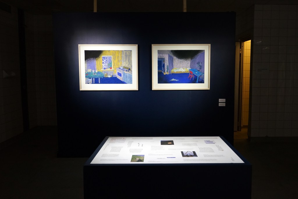 I diptyken My boyfriend’s bedroom/kitchen in Sumy, eastern Ukraine riktas blicken mot hemmet och vardagen i krigets mitt i ett försök att konfrontera betraktarens igenkänning och empati. De två färgglada torrpastellteckningarna kan vid första anblick likna vilken hemtrevlig interiör som helst men tyngs ner av ett mörker som kontrasterar sceneriernas bjärta färger. Ett tejpat fönster ämnat att förhindra glassplitter vid en möjlig bombattack sticker ut och antyder närvaron av ett konstant yttre hot. Verket påminner oss om att kriget, vid sidan av de blodiga fronterna, utspelas lika mycket i alla de hem där livet pågår och fortsätter levas utifrån nya, anpassade förutsättningar.