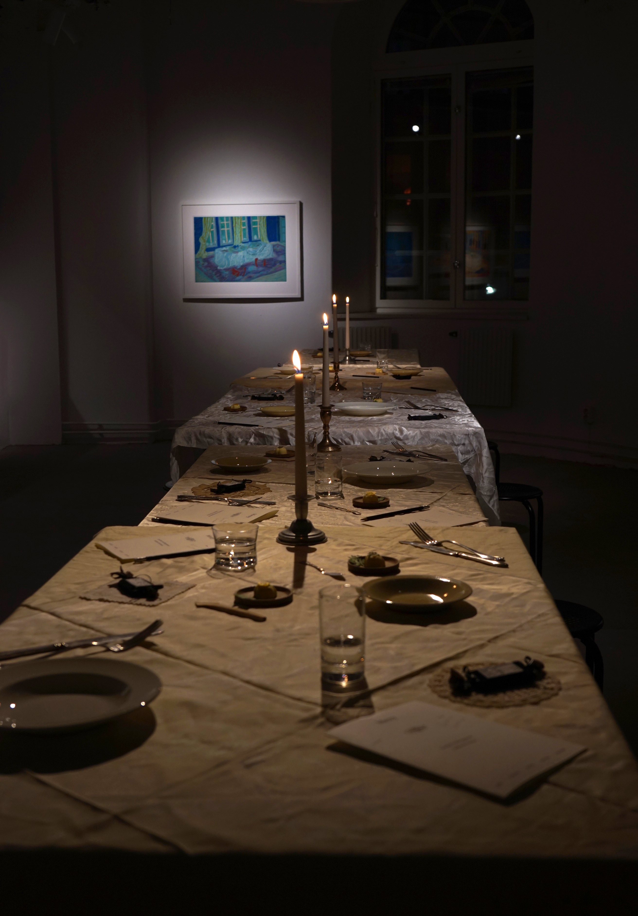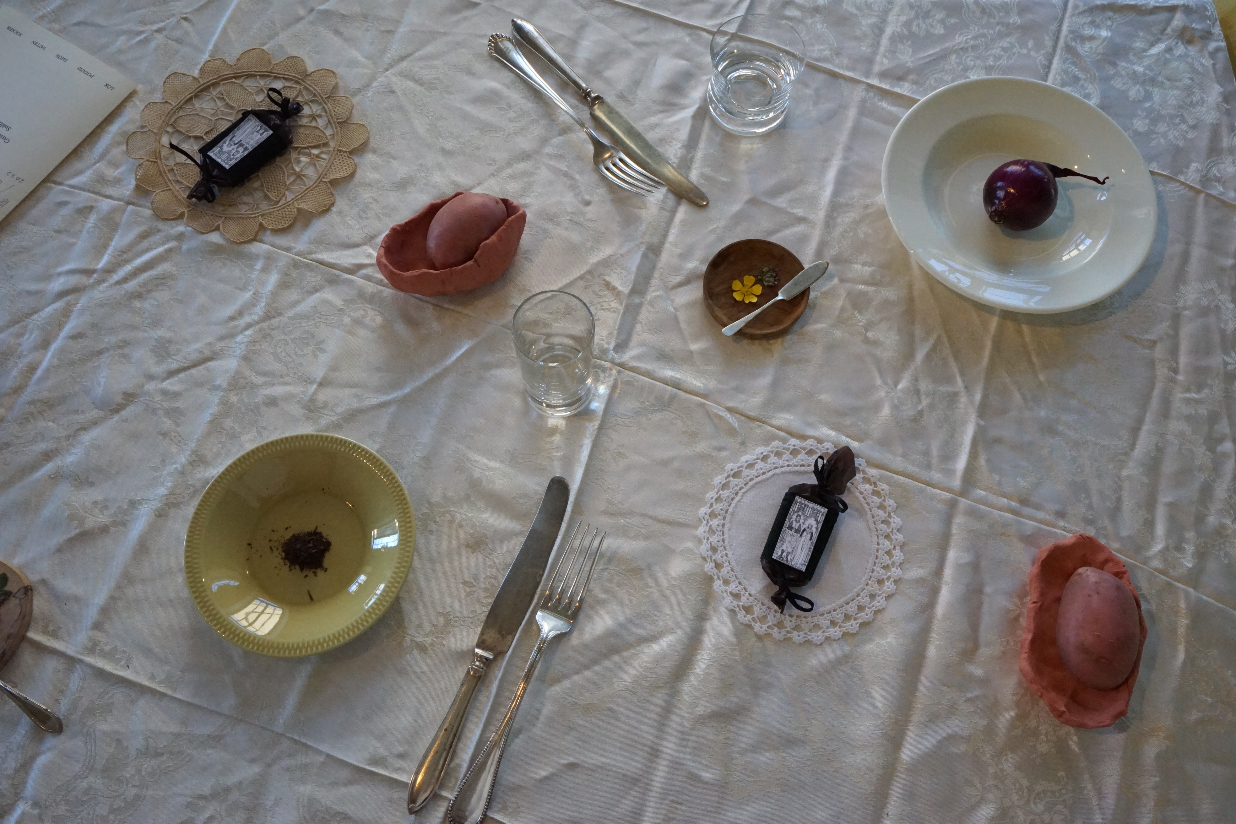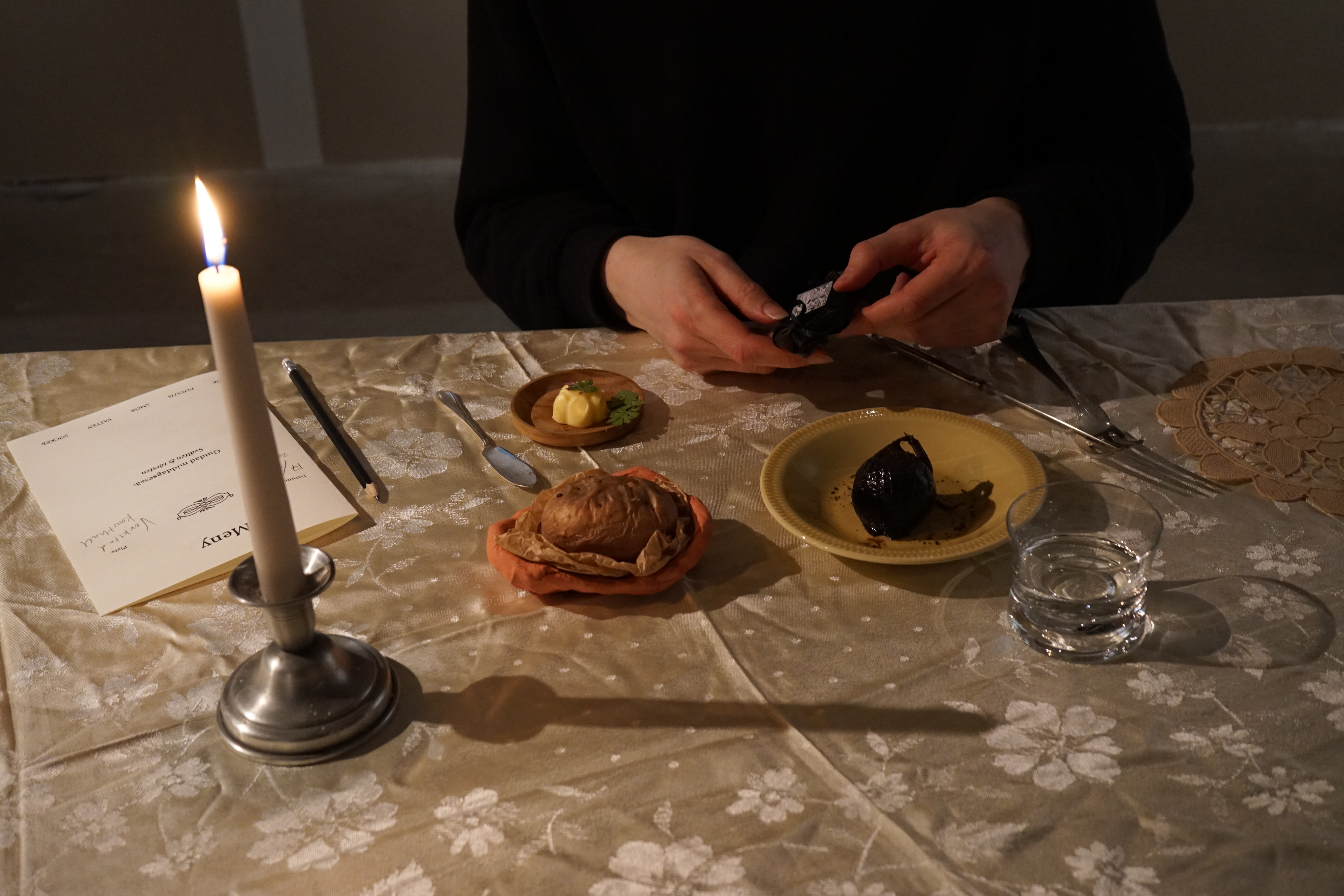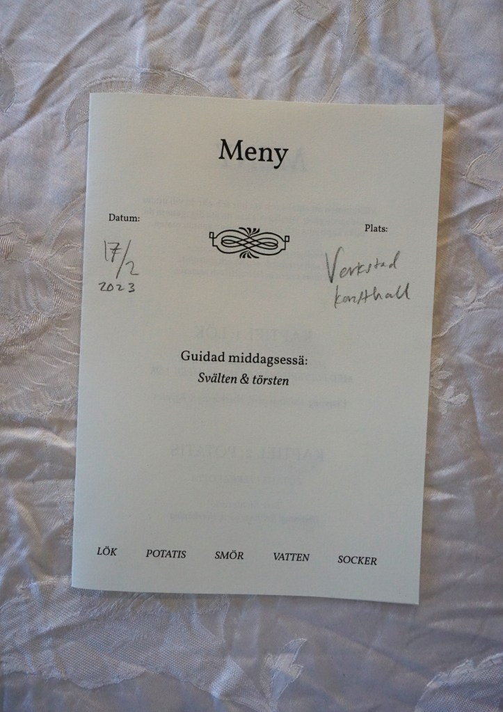 A collaboration between Gustav Lejelind and Mathilda Frykberg. Svälten & törsten is a guided dinner-essay in which guests are invited to the table and, through food and sound, are taken on a journey from the potato riots in Stockholm in 1917 and bubbling water springs in Georgia to Saint Birgitta’s father’s funeral and the magical properties of wild garlic. As a guest, you are invited to taste and reconsider some of our most common ingredients — butter, sugar, potatoes, onions, water — partly through stories of hunger and thirst. The performance was presented in 2023 at Göteborgs konsthall and Verkstad konsthall in Norrköping in a series of sittings with multiple guests.